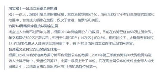 先拿最簡單的網(wǎng)購來說:當(dāng)某寶剛剛進(jìn)入到臺(tái)灣省時(shí),不論是人性化的購物體驗(yàn)還是精細(xì)化分的購物選擇,都比臺(tái)灣當(dāng)?shù)爻涑庵鴣y七八糟廣告的網(wǎng)購平臺(tái)強(qiáng)很多,但有些臺(tái)灣同胞們嘴上說著不要,可身體卻很誠實(shí)的在某寶上瘋狂網(wǎng)購。