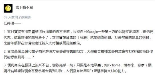 更有網(wǎng)友直言:臺(tái)灣是個(gè)金融和電子商務(wù)解決方案都很守舊的地方,支付寶想在臺(tái)灣發(fā)展根本就是個(gè)偽命題。