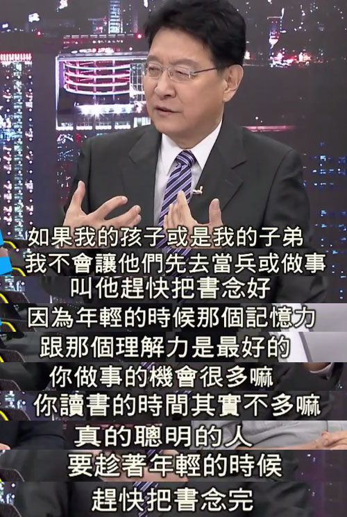 隨后,趙少康也不忘提醒廣大學子,真正聰明的人,要趁著年輕的時候趕快把書念完,因為那時的記憶力和理解力是最好的,以后做事的機會有很多,但讀書的時間實際上卻很少。