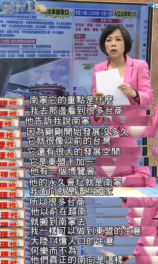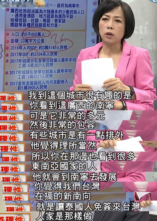 臺灣媒體人黃智賢日前到廣西南寧調研,她在節目中提到:“廣西的南寧,它非常的多元,非常的包容,在那邊可以看到很多東南亞國家的人去那邊發展,可是我們的‘新南向’就是讓泰國人免簽來臺灣,人家(大陸)確實那樣做的。”