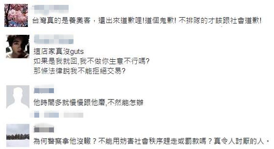 貼文引爆網友怒火,“臺灣真的養奧客,還出來道歉!不排隊的人才該跟社會道歉”“如果是我就回,我不做你生意不行嗎?哪條法律說我不能拒絕交易?”“為何警察拿他沒轍?不能用妨害社會秩序趕走或罰款嗎”。