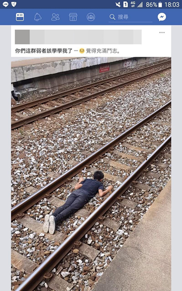 臉譜網“臺鐵家族”轉貼一則貼文,有男子疑似故意趴在鐵軌上,還拍照炫耀說“你們這群弱者該學學我了”。貼文一出,許多抨擊留言一一出現,有網友表示震驚,直說“想死也不要趴在鐵軌上!”,也有網友不以為然,表示“屁孩不意外”“暑假到了屁孩很多”,還有網友說“撞死算了”。