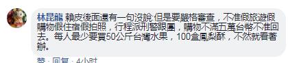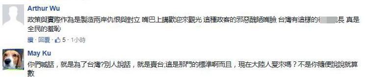 網(wǎng)友也直言,大陸游客赴臺并不是因為島上的觀光資源與設備,“完全是沖著同文同種,兩岸一家親”、“人家是沖著寶島和同胞才來的”、“先承認‘九二共識’吧”、“為了選票又再騙”!