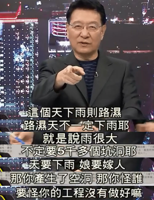 正所謂天要下雨,娘要嫁人,道路產生的問題,當然要歸咎于工程沒有做好,就像臺灣資深媒體人趙少康所言,“下雨則路濕,但路濕卻不一定下雨,雨大不大,跟坑洞的問題并沒有必然的聯系。”