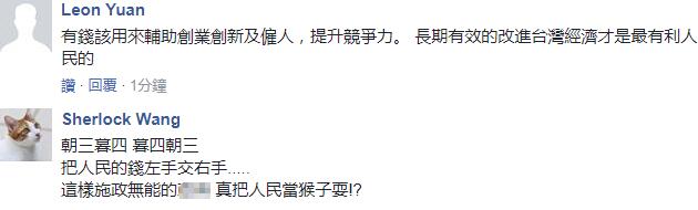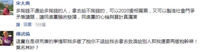 一名黃姓單親媽媽就抱怨,自己要扶養2個小孩,還租房子過生活,每天超時工作賺錢,去年繳了7萬多元的稅,結果自己申請不到補助就算了,如今竟然還要把多出來的稅收拿去給別人,“這是哪門子爛邏輯!”;還有網友炮轟這根本是“史上最大賄選!”