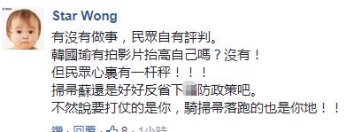 也有網友認為,蘇貞昌根本就是“心虛”或者他很清楚自己所做的事都讓老百姓無感,而只有“無能的人才會細說自己做了什么”,因為“會做事的人不用自己細說,人民都在看”;還有人拿如今風頭正勁的韓國瑜類比,直言“韓國瑜有拿影片抬高自己嗎?沒有!但民眾心中有一桿稱”。