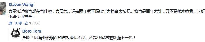 然而面對教育界各方人士的不滿與建議,臺“教育部次長”范巽綠的回應則是,12年義務教育的課綱“僅剩最后一哩路”,堅持8月1日“如期上路”……