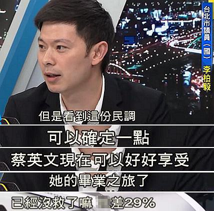 “可以確定的是,蔡英文可以好好享受她的‘畢業之旅’了”,臺北市議員李柏毅順便為正忙著訪“友邦”的蔡英文作了總結,“已經沒救了嘛”~這哥們兒還特逗的暗諷該基金會的民調數字“沒有想好”:29%哪是蔡英文狂輸給賴清德的,分明是對民進黨執政3年來政績的否定嘛!