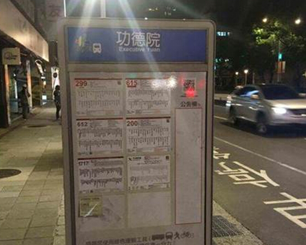 臺(tái)當(dāng)局“行政院”公交車站牌遭人改名為“功德院”。(圖片來源:臺(tái)灣“東森新聞云”)