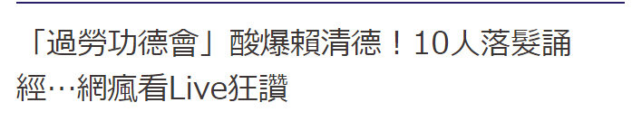 勞團(tuán)與青年團(tuán)體在Facebook成立“過勞功德會(huì)”,3日下午搶先于“行政院”前舉行“過勞大悲功德大法會(huì)”。據(jù)報(bào)道,現(xiàn)場由10名男女青年進(jìn)行“剃度儀式”,率全場民眾誦“清德老君‘勞基法’功德經(jīng)”,并擺設(shè)香案及紙?jiān)莸鹊谰撸粗S“行政院”已經(jīng)變成“功德院”。現(xiàn)場還發(fā)送“功德院”貼紙,搬來“功德金”、紙?jiān)鷱R、金童玉女等法會(huì)道具,更將蔡英文、賴清德、臺(tái)當(dāng)局“勞動(dòng)部長”林美珠的頭像制成“無、量、壽”佛像畫,吸引不少人圍觀。