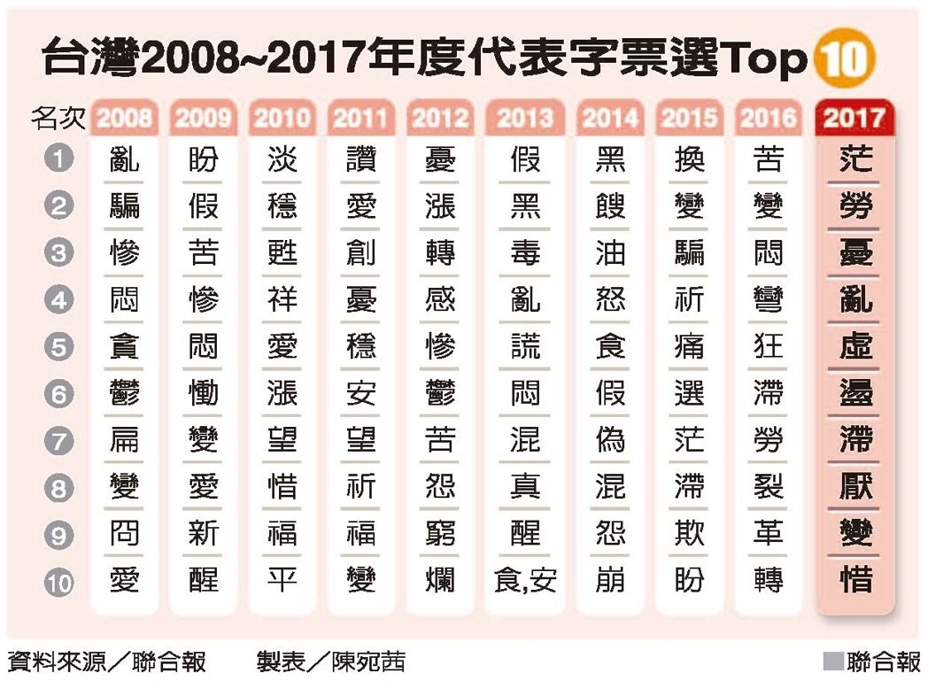臺灣2008~2017年度代表字票選Top10。(圖片來源:臺灣《聯合報》)
