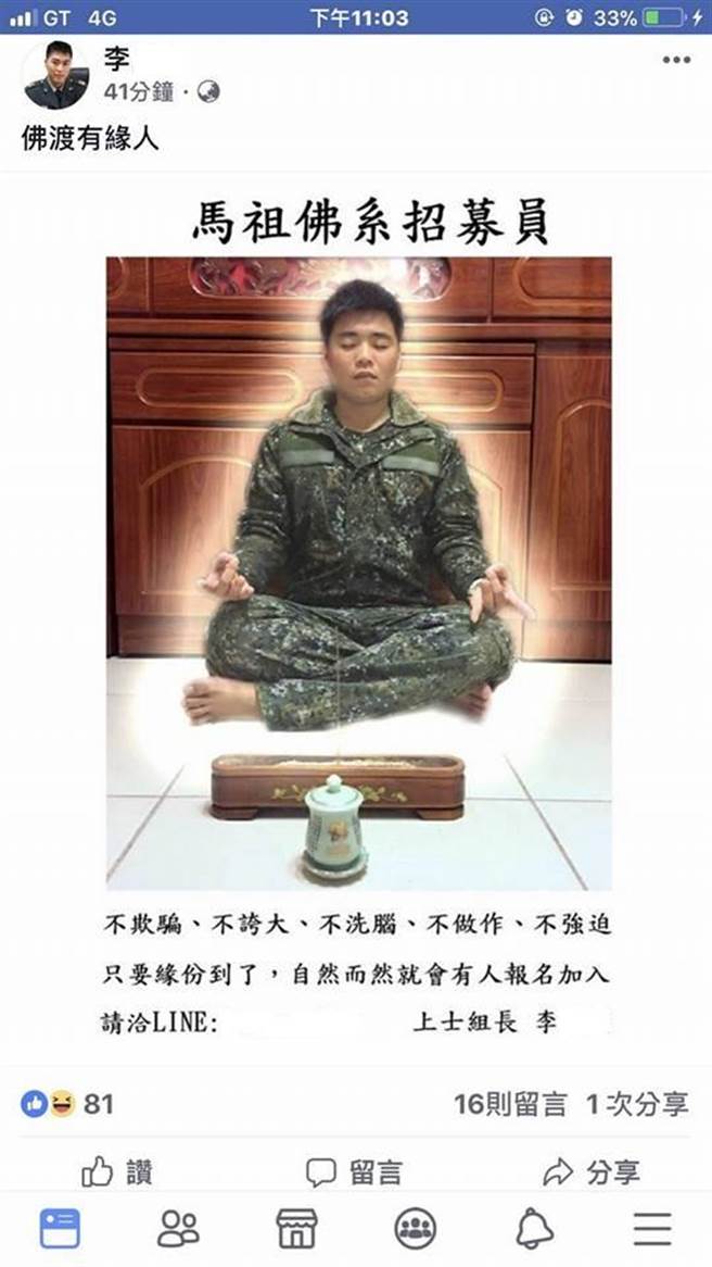 女士官能打美女牌,男士官當然也有自己的怪招。據臺灣《中時電子報》報道,有一位在馬祖服役的軍人在臉譜網貼出合成照片,為一穿著迷彩服的軍人在一香案前打坐,打出“馬祖佛系招募員”,號稱“佛渡有緣人”,“不欺騙、不夸大、不洗腦、不做作、不強迫”,“只要緣份到了,自然而然就會有人報名加入”,并附上Line的賬號,堪稱臺軍另類招募奇招。