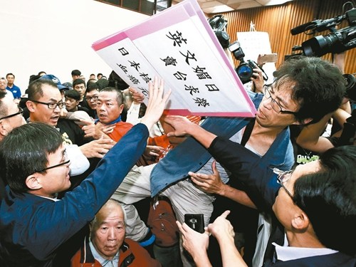 據臺灣《聯合報》報道,臺當局“農委會”12日在云林、嘉義、臺南、高雄連趕4場公聽會。首場臺南場上,國民黨臺南市議員盧昆福、蔡育輝質疑主辦單位做法偷渡,弄翻茶水、資料,與“農委會國際合作處處長”陳俊言爆發口角,陳還被推擠至座位上。會議被迫中斷。