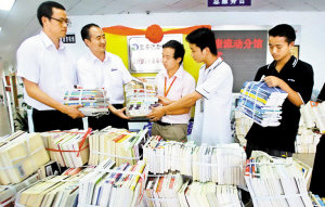 富士康工作人員告訴記者,富士康觀瀾廠區原本就有1000多平方米的閱覽室,這批圖書進廠后,將更好地充實廠區的圖書閱讀資料。據介紹,公司已經安排場地,將在廠區內再建6個圖書閱覽室。(記者 邱海彬 文/圖)