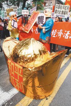 ECFA過關,兩岸和平發展論壇的支持者以行動劇來表達“共享和平紅利,擴大社會福利”的訴求。圖片來源:臺灣《聯合報》