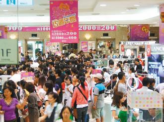 景氣復(fù)蘇,臺灣百貨公司周年慶消費人潮塞爆賣場,大陸游客團為消費主力之一,業(yè)者明顯感受消費者信心回升。圖片來源:臺灣《經(jīng)濟日報》