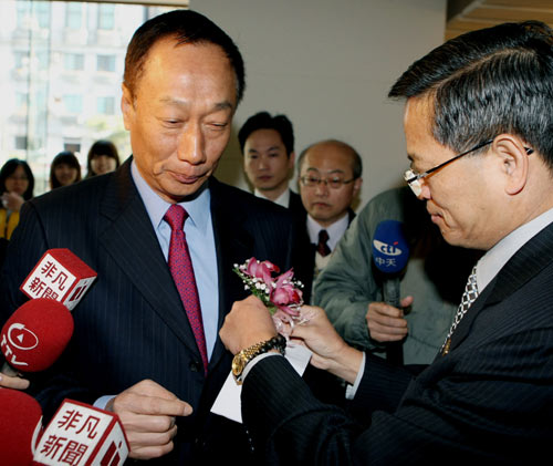 鴻海董事長郭臺銘(左)29日參加活動時透露,2010年鴻海“尾牙”將改變形態,不再吃吃喝喝而已,會與花博合作,邀公益團體參加,改成公益活動型態。 圖片來源:“中央社”