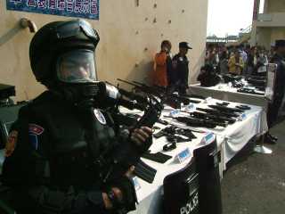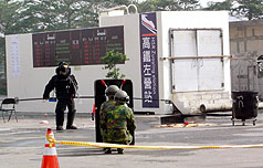 “2007金華演習實兵演練”6日在高雄市舉行,假設2009年世運期間高鐵左營站遭恐怖攻擊,展現軍警對世運維安的應變能力。圖為模擬處理左營車站爆裂物。 來源:“中央社”