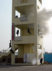 圖為假設高鐵左營站遭恐怖恐擊,歹徒將人質挾持至附近大樓,空降維安特勤人員攻堅營救人質。