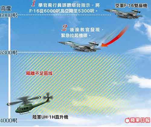 該戰機在下降至5300呎時,同機隨行的后座教官覺得不對勁,要求前座的飛行員再向航管確認高度;當時的航管人員也發現F-16戰機未依規定在6000呎高度,也要求戰機立即改正至6000呎。教官警覺有問題,立即接手飛行操作,緊急將戰機拉高高度,仍差一點與在航道下方,高度約4000多呎的臺陸軍UH-1H直升機發生“空中接近”事件。