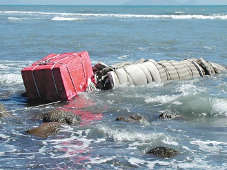2003年失聯魚雷數小時后被發現躺在利澤海邊,海軍人員以棉被包住魚雷,確保安全。來源:臺灣《聯合報》