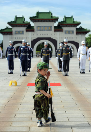 以雨傘模擬“儀仗隊”操槍在島內網(wǎng)絡暴紅的3歲男童 Ryan(前)15日如愿以償,獲臺軍方頒贈205兵工廠制造的仿真迷你木槍,并在臺北忠烈祠與“三軍儀仗隊”一同操槍。 圖片來源:臺灣“中央社”