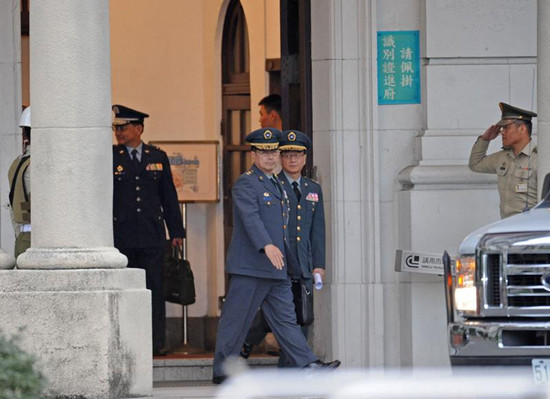 阿帕契案重創(chuàng)臺軍形象,臺防務(wù)部門與臺軍高階將領(lǐng)8日向馬英九報告軍紀安全檢討。圖為臺軍高階將領(lǐng)會后離開馬英九辦公室。圖自臺灣“中央社”