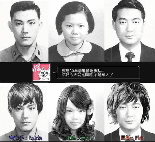 三位2012年臺灣地區領導人候選人年輕時期的照片,顯得靦腆、青澀,就有網友用修圖軟件kuso(惡搞)照片,幫三位候選人改變了新潮的發型,網友說,“要是30年前發藝(理發技術)夠進步,他們現在就不會是敵人,而是樂團團體。”有網友說,馬英九從年輕到現在都很帥,有人說他換上新發型之后,長得像彭于晏,有網友夸贊蔡英文換了發型之后,臉變小、也變漂亮了!