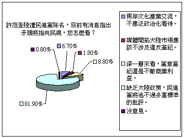 中國(guó)臺(tái)灣網(wǎng)7月29日消息 臺(tái)灣《中時(shí)電子報(bào)》最新在線民調(diào)“許、范登陸遭民進(jìn)黨除名,目前有消息指出矛頭將指向民視,您怎么看?” 至29日上午8點(diǎn)為止,累計(jì)投票897票,超過(guò)八成參與投票的臺(tái)灣網(wǎng)友選擇“缺乏大陸政策,民進(jìn)黨將逃不過(guò)多重標(biāo)準(zhǔn)的批評(píng)。”