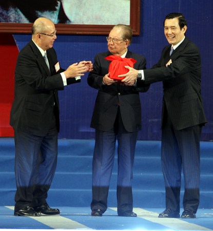 馬英九從吳伯雄手中接過黨主席印信。(圖片來源 臺(tái)灣“中央社”)