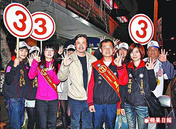 國(guó)民黨秘書(shū)長(zhǎng)金溥聰(中)昨陪著國(guó)民黨花蓮“立委”補(bǔ)選候選人王廷升到花蓮綜合市場(chǎng)拉票。來(lái)源:臺(tái)灣《蘋(píng)果日?qǐng)?bào)》