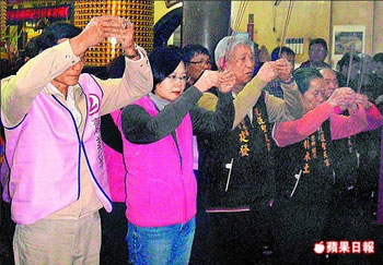 民進(jìn)黨主席蔡英文(左二)昨前往花蓮城隍廟祈福,并替民進(jìn)黨籍候選人蕭美琴助選。來(lái)源:臺(tái)灣《蘋(píng)果日?qǐng)?bào)》
