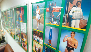 如果來到蔡同榮研究室,一定不會搞混,因為一打開房間門,就是蔡同榮兩大巨幅人頭照,再往前望去,一整排的個人記錄照片更是精采,不但有他與夫人結婚的照片、女兒結婚時與父親共舞的照片、最經典的當然就是蔡同榮最引以為傲的裸上半身之胸肌玉照,張張精采,簡直就是用照片寫出一部自傳。