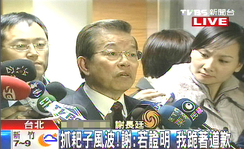 謝長廷今天出面為自己辯駁,期間似乎眼泛淚光,他強(qiáng)調(diào):“假如有人能夠證明這個(gè)秘密有泄露(是我泄露的),有關(guān)單位有掌握這個(gè)秘密,如果施先生(施明德)能夠證明,我跪著跟他道歉。”(陳佳慧)