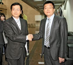 馬英九辦公室發言人羅智強(左)、民進黨發言人蔡其昌7日協商ECFA辯論會相關事宜,兩人一見面相互握手頗有先禮后兵的意味。圖片來源:臺灣《中國時報》