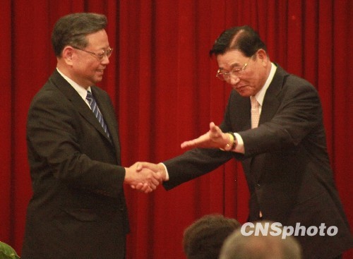 5月5日,臺灣海基會董事長江丙坤在臺北圓山大飯店舉行午宴,歡迎福建省長黃小晶率福建省經貿文化交流團來臺訪問。兩位老朋友相見甚歡,期待透過此次訪問進一步推動兩地全方位交流合作。 中新社發 羅欽文 攝