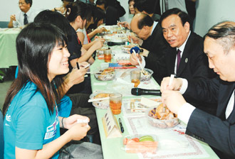 浙江省長呂祖善昨參訪臺灣大學,午餐時與臺大學生輕松地話家常。圖片來源:臺灣《聯合報》