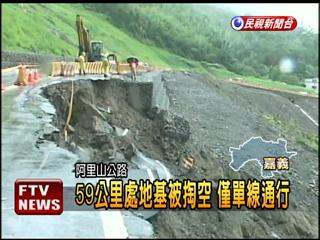 阿里山公路71公里處,因?yàn)椴粫r(shí)有落石坍方造成交通一度中斷,經(jīng)過(guò)緊急搶修加上實(shí)施管制后,才勉強(qiáng)通行。而阿里山公路59公里的路段,路基整個(gè)被掏空,路面和護(hù)欄都和崩塌的土石一起滾落,現(xiàn)場(chǎng)圍起封鎖線(xiàn),只能勉強(qiáng)維持單線(xiàn)雙向通車(chē)。