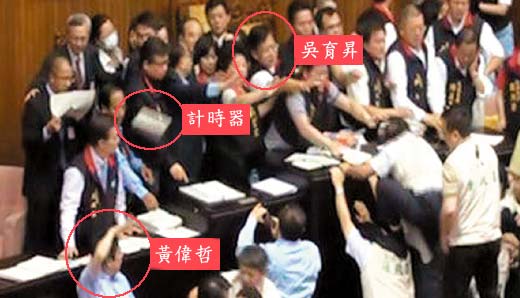臺灣“立法院臨時會”今年7月8日處理兩岸經濟合作框架協議(ECFA)逕付二讀時,藍綠發生推擠沖突,混亂中吳育升遭計時器砸中。國民黨“立法院”黨團事后調出錄像帶發現,原來是民進黨“立委”黃偉哲以“勾射”方式,冷不防向國民黨“立委”群集處拋出定時器,不偏不倚砸中國民黨“立委”吳育升頭部。