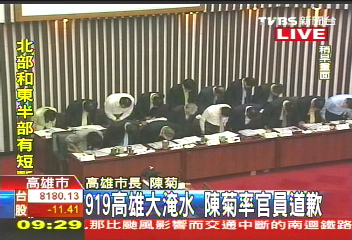 據(jù)報道,高雄市議會今天的議程是高雄市政總質(zhì)詢,高雄市議員黃淑美質(zhì)詢陳菊對高雄市及市民飽受淹水之苦的感想。說到此, 高雄市長陳菊率領(lǐng)全體市府官員,向高雄市民鞠躬道歉。她表示,“深深一鞠躬,跟高雄市民,我們的鄉(xiāng)親道歉,非常抱歉,我們做得不夠好,我們必須更努力。”