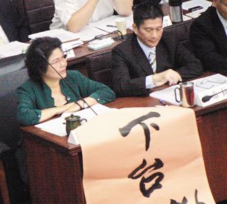 高雄市議會(huì)29日上午進(jìn)行市政總質(zhì)詢,市議員梅再興在陳菊座位前貼上“下臺(tái)”海報(bào)。來(lái)源:臺(tái)灣《聯(lián)合報(bào)》