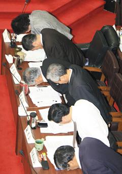 陳菊(穿灰衣者)28日在市議會(huì)答詢時(shí),率高雄市政府官員鞠躬致歉。 來(lái)源:臺(tái)灣《聯(lián)合報(bào)》