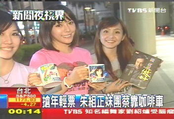 據(jù)報道,朱立倫于昨日晚間成立了“正妹助選團”,共5名美女成員,其中有一位還曾與鐘漢良拍過戲。5名美女身穿印有朱立倫頭像的T恤,忙碌地派發(fā)文宣,推銷商品,幫忙募款,還要與前來合影的臺灣年輕民眾合影,“正妹團”的一名成員“米果”表示實在是太過忙碌,不過感覺“很值得”,算是經(jīng)驗和學(xué)習(xí)。