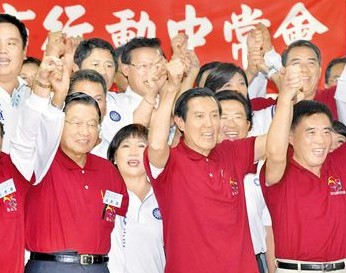 國民黨主席馬英九拉著臺北市長郝龍斌的手高喊“凍蒜”(指當選)。圖片來源:臺灣《中國時報》