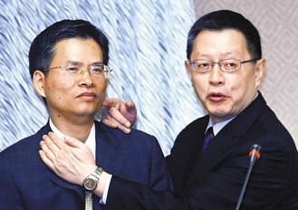 “立法院內政委員會”昨天聽取“1126槍擊案”項目報告,“警政署長”王卓鈞(右)、“法務部檢察司副司長”林錦村(左)分飾槍手林正偉與被害人連勝文,還原槍擊案發生當時狀況。圖片來源:臺灣《聯合報》