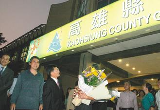 高雄縣長楊秋興昨天與高雄縣政府一同“畢業”,臨行前他回望高雄縣政府招牌最后一眼。圖片來源:臺灣《聯合報》