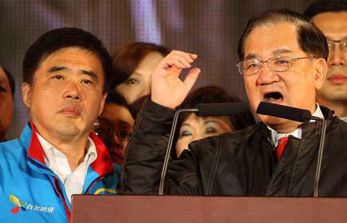 國民黨榮譽主席連戰(右)11月26日晚間出席“我愛臺北我的家─郝龍斌(左)選前之夜”活動,提到兒子連勝文被槍擊,哽咽譴責暴力行為。