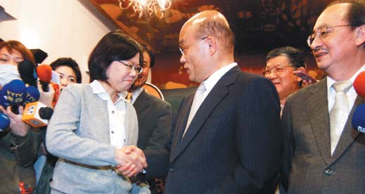 民進黨主席蔡英文(左二)搶在蘇貞昌(右二)前宣布參選2012。蘇貞昌因未受邀參與,昨天酸溜溜地說,“不要因為主席參選,而耽誤黨務工作”。圖片來源:臺灣《聯合報》