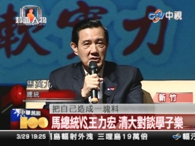 臺(tái)灣清華大學(xué)慶祝“百年校慶”,3月29日邀請馬英九與臺(tái)灣偶像歌手王力宏以為題 “夢想造就軟實(shí)力”對談。據(jù)臺(tái)灣《今日新聞》報(bào)道,61歲的馬英九和35歲的王力宏都穿著西裝搭牛仔褲出席,主持人、前臺(tái)灣清華大學(xué)校長劉炯朗一度要求兩人唱歌,馬英九笑說,“在王力宏面前班門弄斧,不是要我老命嗎?”王力宏則說,“總統(tǒng)”應(yīng)該不好當(dāng)吧?后來王力宏清唱一段英文歌,才引導(dǎo)馬英九唱出一個(gè)字,博得全場熱烈掌聲。