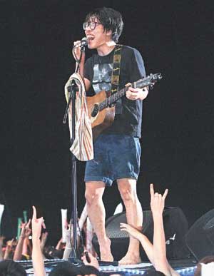 天氣太熱,歌手盧廣仲干脆脫掉鞋子獻唱,炒熱現場氣氛。圖片來源:臺灣《聯合報》